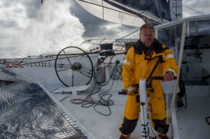 The crew of IDEC SPORT have have had their foot down since they entered the Forties, watch after watch taking it in turns to deal with this high speed sailing. “Conditions were right to allow us to sail quickly and without too much work,” explained Francis Joyon, far from any triumphalism after seeing the ocean covered in just a few days. “We are concentrating on our job at the helm, staying there for no longer than half an hour and paying attention to the trimming. Always on the port tack, manoeuvres involved taking in or shaking out a reef and modifying the headsail. That was the case last night, when we ran into an area of squalls that were not forecast. “The talent of the helmsmen is working wonders on these calm seas. “We are entering a transition zone today between the low that has been behind us for several days and a new low forming ahead of us,” added Bernard Stamm. “As long as these two systems don’t merge, wind conditions should remain unstable.” IDEC SPORT is continuing at high speed with wind on the beam from the north, which can be tricky when the giant trimaran lifts up her windward float. “More than ever, as we are beginning to feel tired, we need to be cautious at the helm and at the sheets,” insisted Captain Joyon.