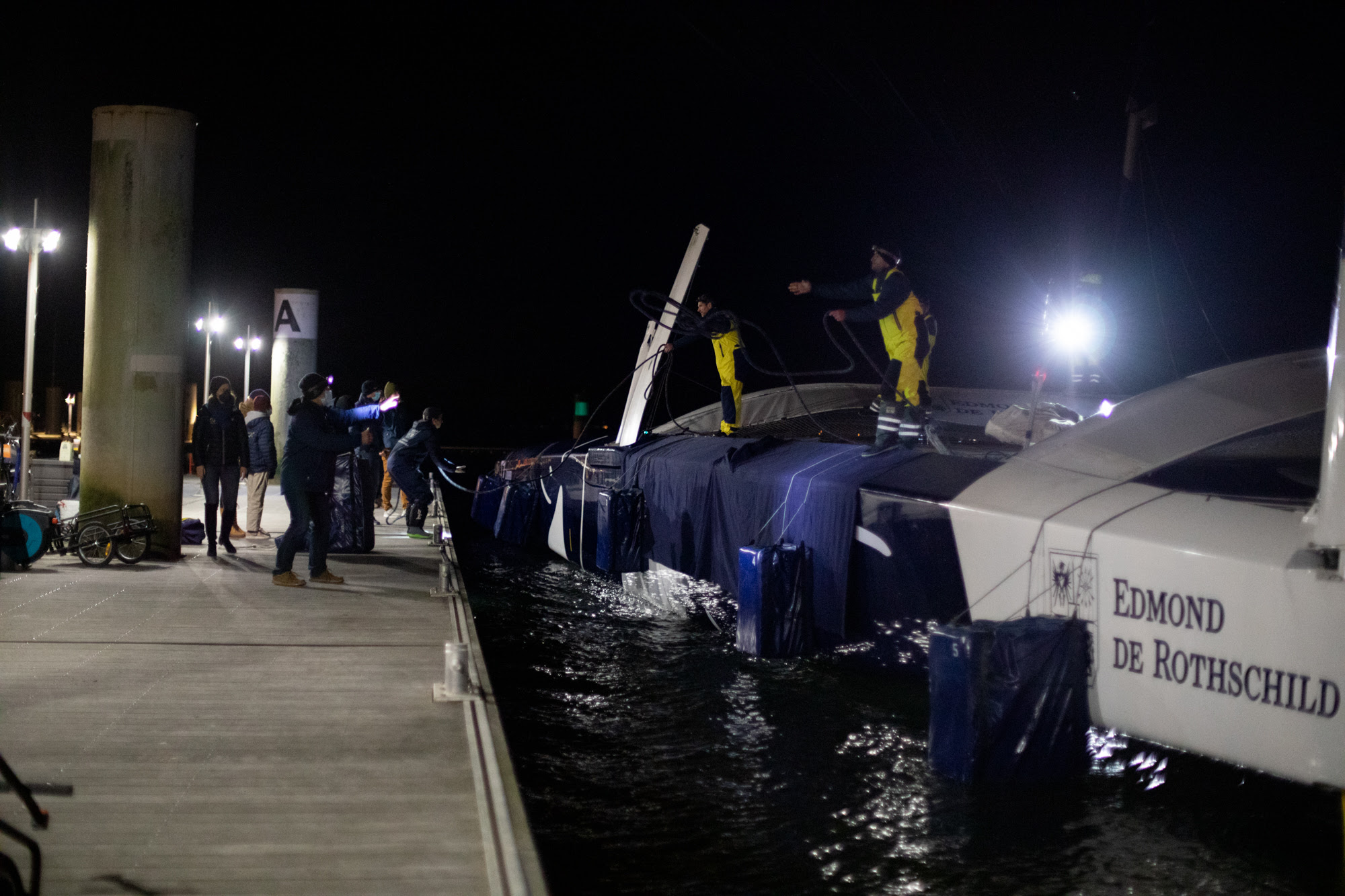 2 December 19:30 UTC – Five days after interrupting their record attempt, the six sailors on the Maxi Edmond de Rothschild make it back to Lorient, welcomed by the members of Gitana Team, who are ready to take up the baton.