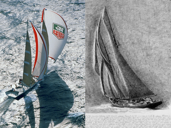 Titouan Lamazou soon put all his efforts into creating a gigantic monohull capable of meeting the challenge. He readily saw himself as an heir to Rudyard Kipling’s Captain Courageous, at the helm of cod-fishing schooners that would crisscross the Grand Banks of Newfoundland in the 19th century until the dawn of the 20th century. His Tag Heuer, 44 meters long, would be the descendant of the Bluenose – also 44 meters – a mythical Canadian schooner that, for years, dominated the Fisherman’s Trophy invented by Sir Thomas Lipton for this type of boat, and that marked the golden age of Western “working” sailing.