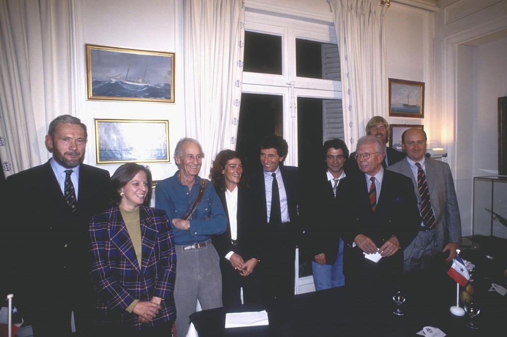 Official launch of the Jules Venre Trophy, on 20 October 1992, in the lounge of the Yacht Club of France. From left to right : Robin Knox-Johnston, Frédérique Bredin, minister of sports, Bernard Moitessier, Florence Arthaud, Jack Lang, minister of culture, Titouan Lamazou, Charles Josselin, miniter of sea, Peter Blake and François Carn, président of the Yacht Club de France. © Photo Gilles Klein